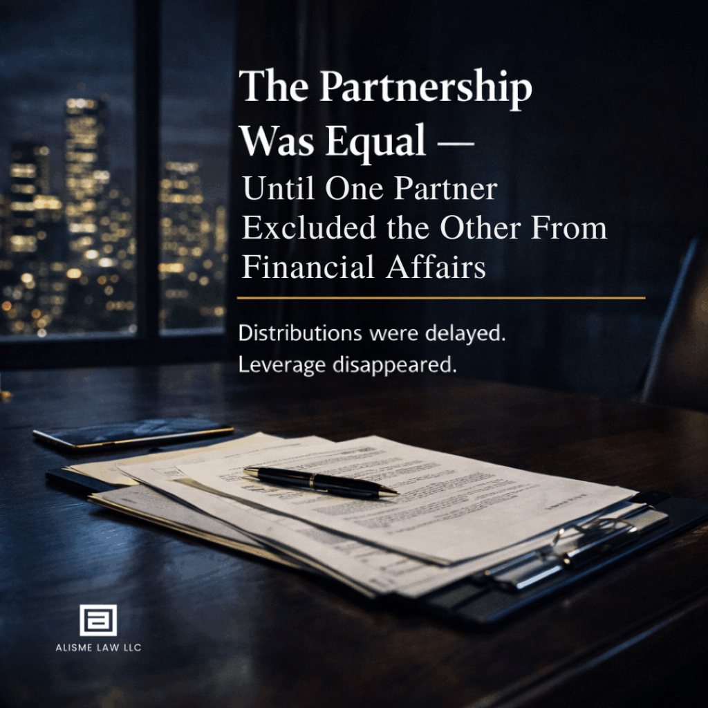While ownership remained unchanged, financial control quietly consolidated. The excluded partner continued operating under the assumption that the agreement was still being honored.